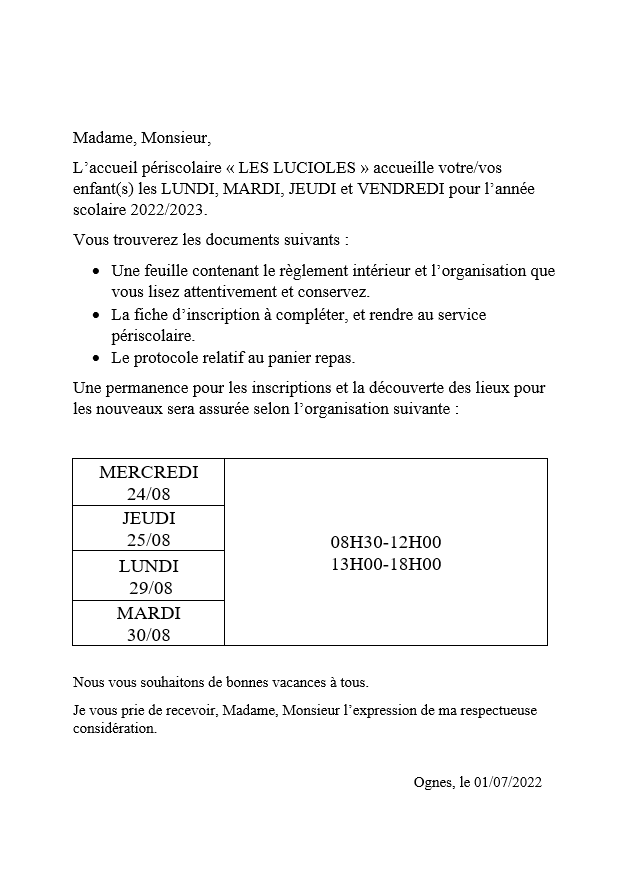 Les inscriptions ainsi que la découverte des lieux pour les nouveaux auront lieu le mercredi 24, jeudi 25, lundi 29 et mardi 30 août 2022 de 8h30 à 12h00 et de 13h00 à 18h00 dans la salle du conseil communal en mairie.