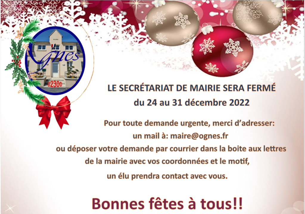 Le secrétariat de la mairie sera fermé du 26 décembre 2023 au 2 janvier 2024.